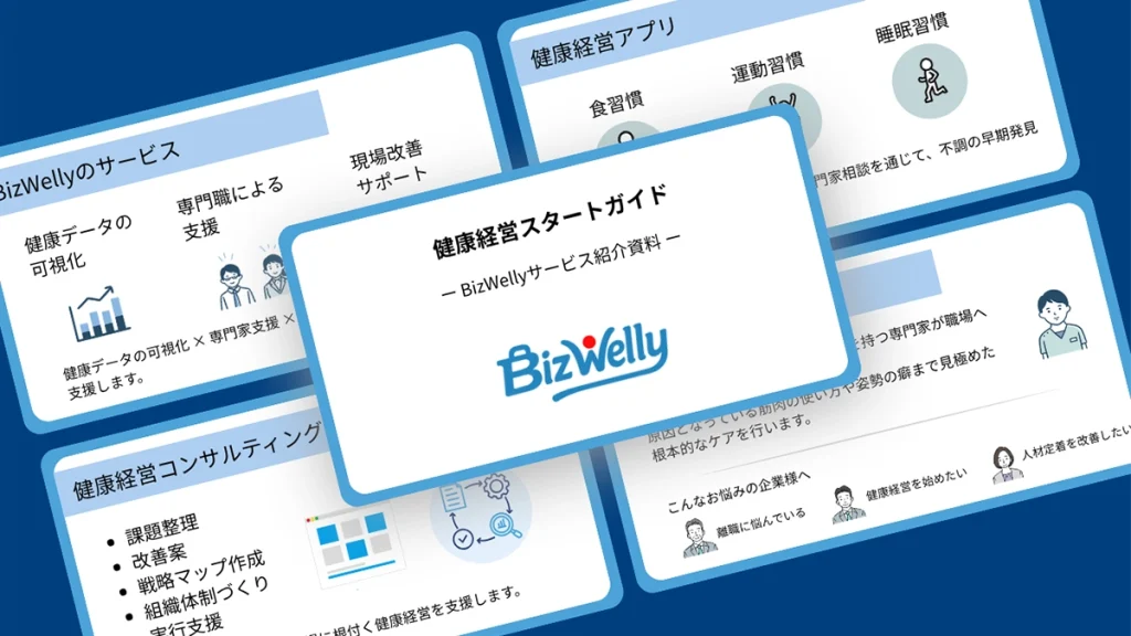 本資料では、中小企業の健康経営®を現場から支援するBizWellyのサービス全体像をご紹介しています。医療専門家チームによるコンサルティング、セラピストの出張施術という2つのサービスの詳細から、導入の流れ・料金プランの目安まで、まとめてご確認いただけます。